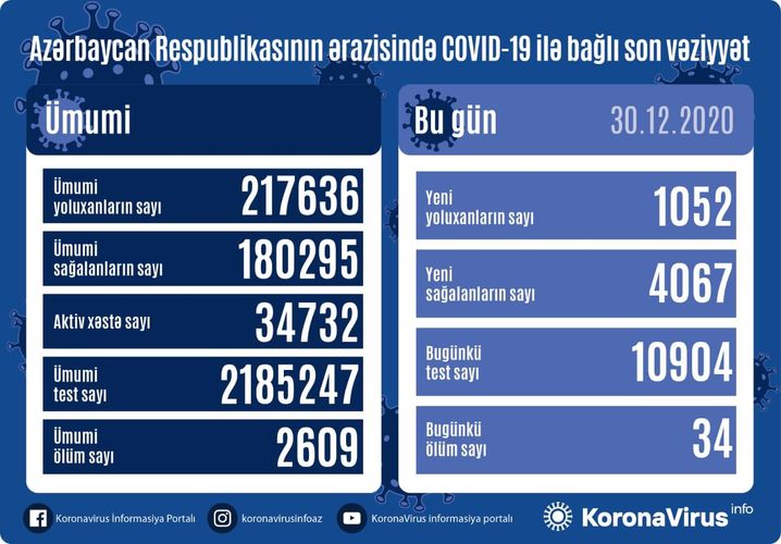 Ümumi yoluxanların sayı 217 636 nəfər, ümumi sağalanların sayı 180 295 nəfərdir.
