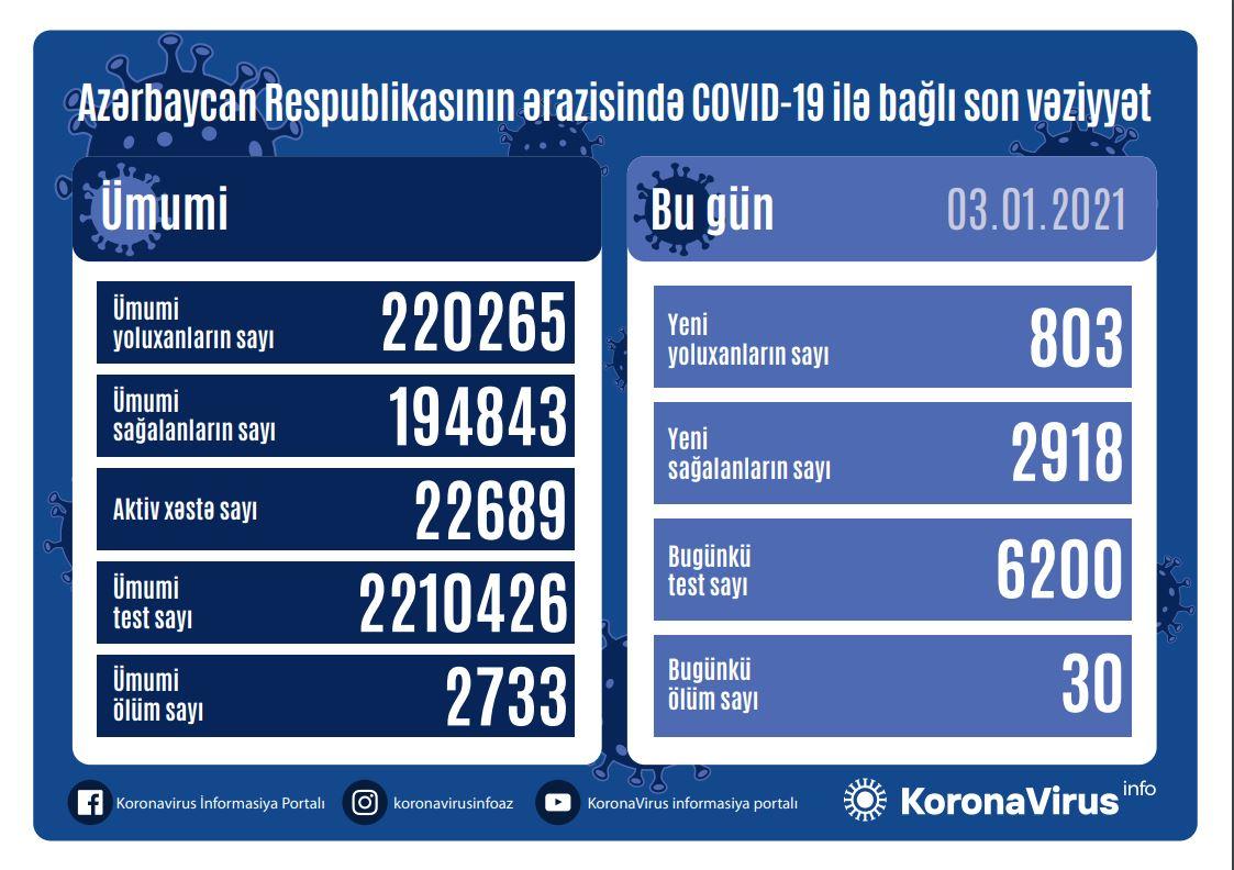 Azərbaycanda daha 803 nəfərdə koronavirus aşkarlanıb, 30 nəfər ölüb