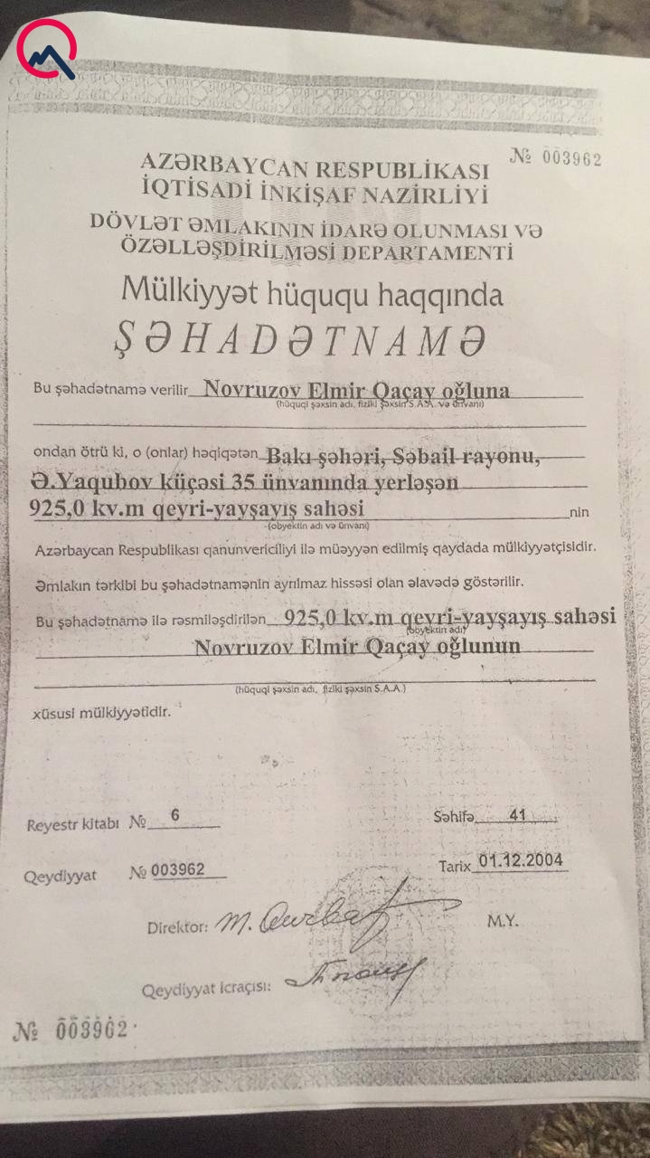 F. Novruzovun sözlərinə görə, həmin qeyri-yaşayış sahəsi mülkiyyət hüququ ilə atası Novruzov Elmir Qaçay oğluna məxsusdur. Bu barədə Dövlət Əmlakının İdarə Olunması və Özəlləşdirilməsi Departamenti tərəfindən 01.12.2004-cü il tarixli, “Mülkiyyət hüququ haqqında şəhadətnamə” verilib və 6 saylı reyestr kitabının 41-ci səhifəsində müvafiq qeydiyyat aparılıb.