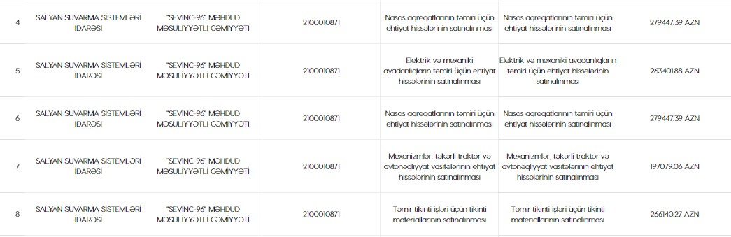 Nasos aqreqatlarının təmiri üçün ehtiyat hissələrinin satınalınması adlı tenderə görə İdarə Şirkətə 279447.39 AZN, Elektrik və mexaniki avadanlıqların təmiri üçün ehtiyat hissələrinin satınalınması adlı tenderə görə 263401.88 AZN, Nasos aqreqatlarının təmiri üçün ehtiyat hissələrinin satınalınması adlı tenderə görə 279447.39 AZN, Mexanizmlər, təkərli traktor və avtonəqliyyat vasitələrinin ehtiyat hissələrinin satınalınması adlı tenderə görə 197079.06 AZN, Təmir tikinti işləri üçün tikinti materiallarının satınalınması adlı tendeerə görə isə 266140.27 AZN ödəyəcək.![]()