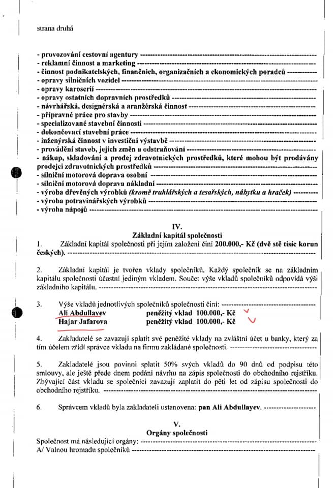 Onun sözlərinə görə, şirkət 2008-ci ilin iyun ayında Praqa Bələdiyyə Məhkəməsində qeydiyyatdan keçib, fəaliyyət sahəsinə mülk və digər daşınmaz əmlak növlərinin kirayəsi daxildir.