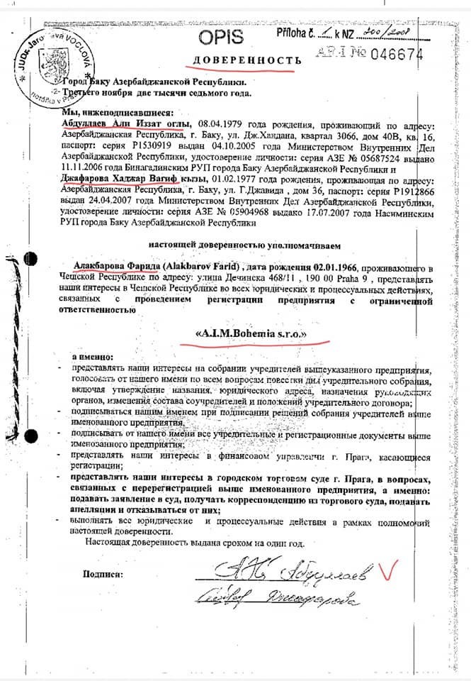 Rabitə və Yüksək texnologiyalar nazirinin birinci müavini Abdullayev Əli İzzət oğlu Çexiya paytaxtında, Ruzova 947/8 ünvanında hüquqi qeydiyyatda olan AIM BOHEMİA S.R.O şirkətinin həmtəsisçisidir.