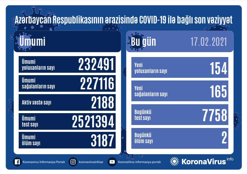 Azərbaycanda koronavirus (COVID-19) infeksiyasına 154 yeni yoluxma faktı qeydə alınıb, 165 nəfər müalicə olunaraq sağalıb.
