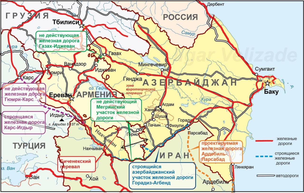 Mən bu xəritəni tərtib edəndə burada həm hazırda inşa olunan dəmiryollarını, eyni zamanda avtomobil yollarını da göstərmişəm. Çünki avtomobil yolları region üçün böyük əhəmiyyət daşıyır. Xüsusilə də yükdaşınmaların böyük TIR-lar vasitəsilə həyata keçirilməsini nəzərə alaraq təbii ki, avtomobil yolları da bölgə üçün çox vacib nəqliyyat infrastrukturu hesab edilir. Ona görə, onları da qeyd etmək yaxşı olardı. Xəritədə konkret olaraq Ermənistanın baş nazirinin mətbuat xidmətinin rəhbəri belə bir şey deyib ki, güya müzakirə olunan məsələlərdə deblokada məsələləri (Zəngəzur dəhlizi) gündəmdə deyil. Bu, əslində belə deyil. Çünki biz çox gözəl başa düşürük ki, üçtərəfli bəyanatda (10 Noyabr) xüsusi bənd var ki, orada bu məsələ konkret göstərilib. Yaxşı, bu bənddə göstərilib ki, Naxçıvanla Azərbaycanın birləşməsini nəzərdə tutan yollar bərpa olunur, amma bir çox hallarda geniş ictimiyyət bu yolların haradan keçdiyi haqda təsəvvürə malik deyil. Xəritədə bu məsələlər əksin tapıb.