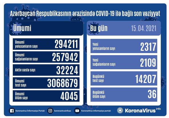 Azərbaycan Respublikasında koronavirus (COVID-19) infeksiyasına 2 317 yeni yoluxma faktı qeydə alınıb, 2 109 nəfər müalicə olunaraq sağalıb.