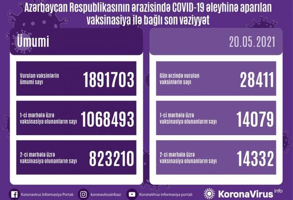 Ölkədə vurulan vaksinlərin ümumi sayı 1 891 703, birinci mərhələ üzrə vaksinasiya olunanların ümumi sayı 1 068 493, ikinci mərhələ üzrə vaksinasiya olunanların sayı isə 823 210 təşkil edir.