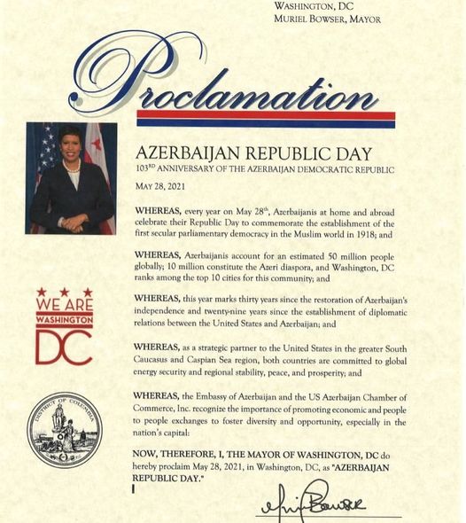 Vaşinqton şəhərinin meri Myuriel Bauzer Azərbaycan Demokratik Respublikasının yaranmasının 103-cü ildönümü ilə bağlı 28 May tarixini Respublika Günü elan edib və bununla bağlı bəyannamə imzalayıb.