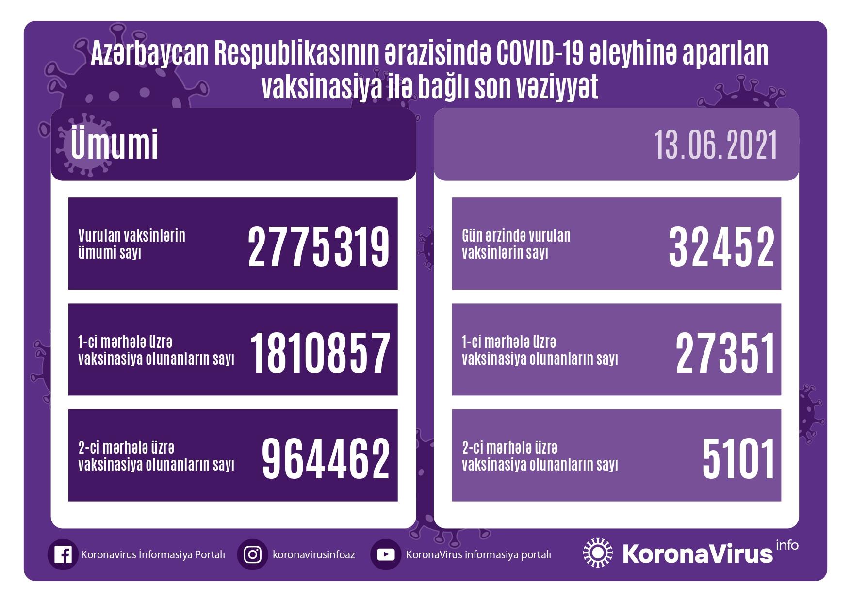 Gün ərzində birinci mərhələ üzrə vaksinasiya olunanların sayı 32 452, ikinci mərhələ üzrə vaksinasiya olunanların sayı isə 5 101 nəfər təşkil edib.