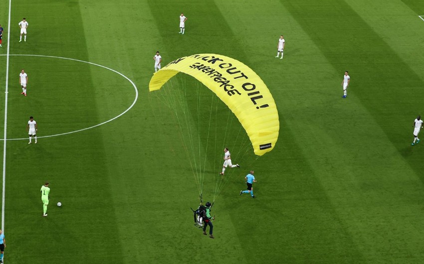 Fransa və Almaniya milli komandaları arasında Münhendə keçirilən Avropa çempionatı oyunu başlamazdan əvvəl azarkeşlərdən biri paraşütlə meydana enib.