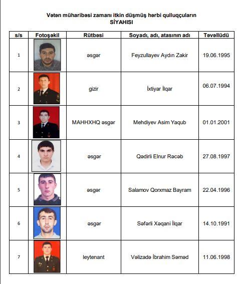 Rubrika.Az xəbər verir ki, iyulun 14-dək itkin düşmüş hesab olunan 7 nəfərin foto şəkilləri, adları, soyadları, hərbi rütbəsi və doğum tarixi haqqında məlumat təqdim olunur.