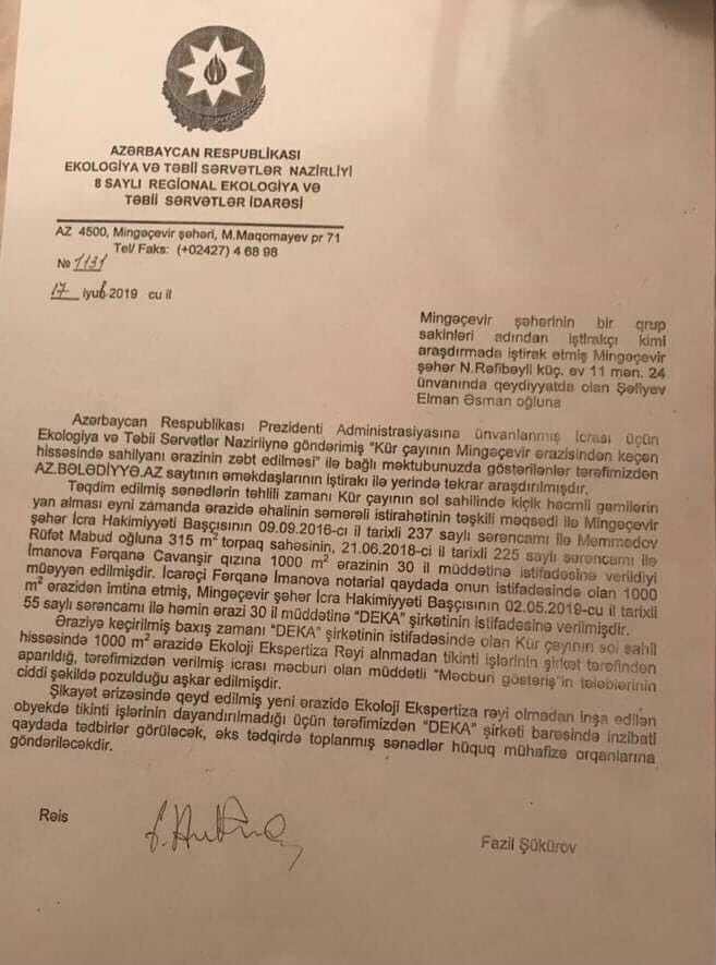 Bu vəziyyətə etiraz edən 117 şəhər sakininin imzası ilə Mingəçevir Şəhər İcra Hakimiyyətinə, Prezident Administrasiyasına və Ekologiya və Təbii Sərvətlər Nazirliyinə şikayət ərizəsi göndərilib.![]()