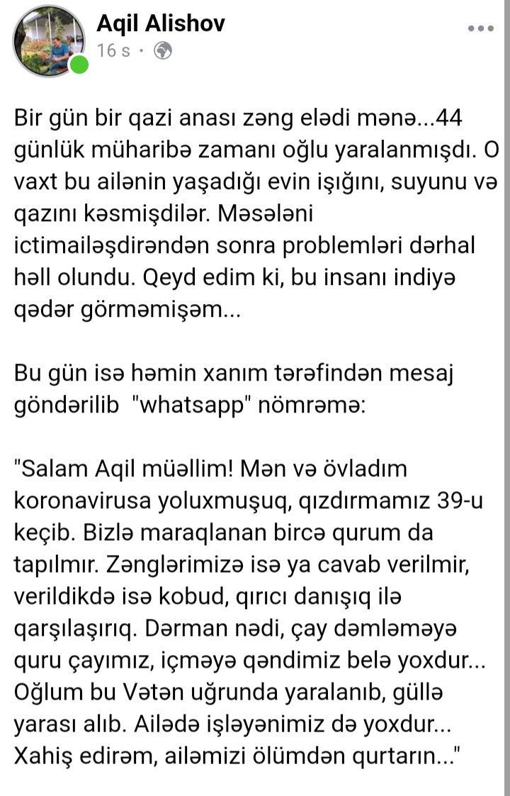 Vətən müharibəsi qazisi olan qardaşımızın ailə üzvləri virusa yoluxsalar da, müraciət etdikləri heç bir dövlət qurumundan köməklik göstərilməmişdi. Xatırladım ki, maddi baxımdan çətinlik çəkən qazimizə hər gün vətənpərvərlikdən ağzı köpüklənə-köpüklənə danışanların biri də yaxın durmayıb. Azad olunmuş torpaqlarda şəkil çəkdirib poza verənlər bu vətənin qazilərinə sahib çıxmırlar.![]()