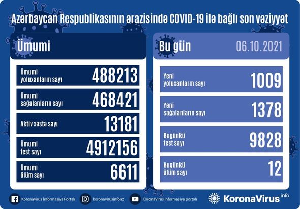 Azərbaycan Respublikasında koronavirus (COVID-19) infeksiyasına 1009 yeni yoluxma faktı qeydə alınıb, 1378 nəfər müalicə olunaraq sağalıb.