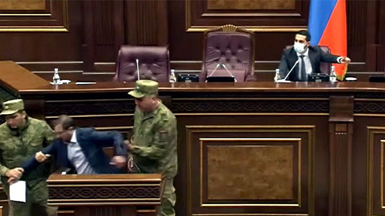 Lakin Robert Koçaryanın partiyasını təmsil edən deputat Qeqam Manukyan parlament tribunasına çıxaraq, V.Xaçatryanı “satqın” adlandırıb və “kim Qarabağdan imtina edirsə və onu unudursa, satqındır” deyib. Bunu bir neçə dəfə təkrarlayandan sonra iclasa sədrlik edən vitse-spiker Ruben Rubinyan onun çıxışına müdaxilə edərək, “kimdir satqın” deyə soruşub. Manukyan isə bu sözləri V.Xaçatryanın dediklərinə cavab olaraq söylədiyini deyib. Bundan sonra vitse-spiker ondan tribunanı tərk etməsini tələb edib. Lakin Manukyan imtina etdiyi üçün Rubinyan mühafizə xidmətini çağırıb və xidmətin əməkdaşları Koçaryanın adamının “mitilini atıblar bayıra”.