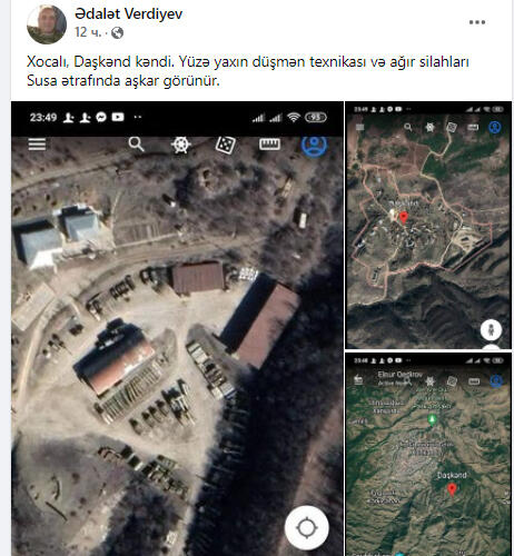 Ekspertin təqdim etdiyi peyk görüntülərindən aydın olur ki, düşmən Xocalı rayonunun Daşkənd kəndinə tank, top və 100-ə yaxın ağır texnika toplayıb.