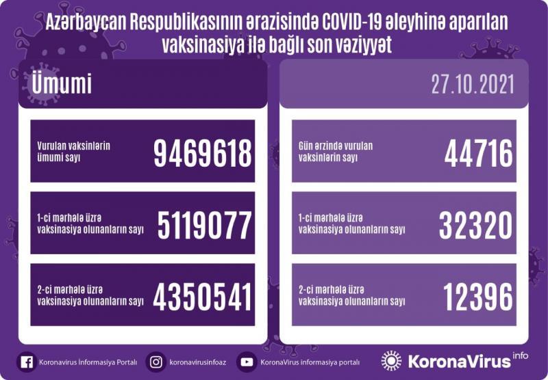 ..Azərbaycanda son sutkada koronavirus (COVID-19) əleyhinə 44 716 vaksin vurulub.