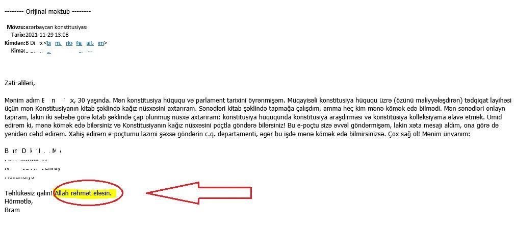 RUBRİKA.AZ xəbər verir ki, bu barədə qurumdan bildirilib.Məlumata görə, qurumlardan birinə göndərilən çaşdırıcı məktubda vətəndaşın hansısa kömək istədiyi və bunun üçün müraciət etdiyi qeyd edilib. Sonra isə səhvən "Allah rəhmət eləsin" yazılıb.(yeniavaz.com)![]()
