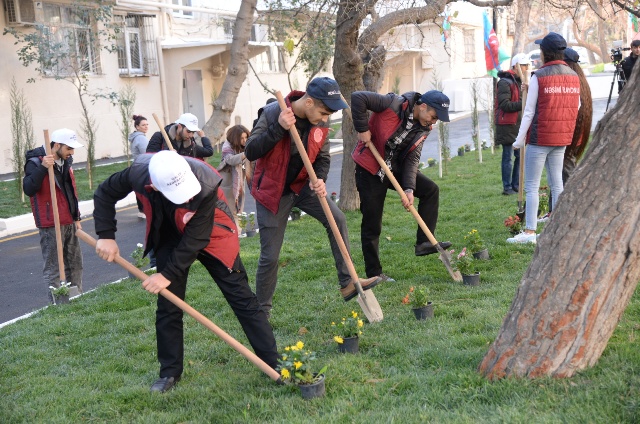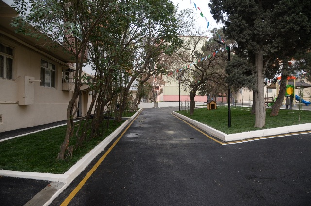 Həyətin ərazisindəki mövcud yaşıllıqların bərpası ilə yanaşı, 50 ədəd müxtəlif növ həmişəyaşıl ağac əkilib və yaşıllıqların suvarılması üçün su xətti çəkilib.