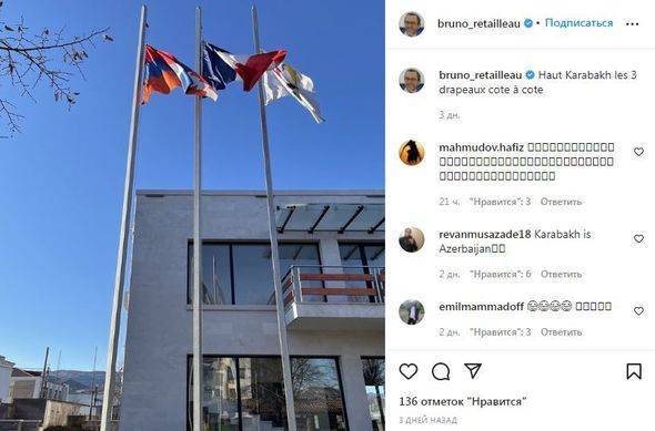Belə ki, siyasətçini müşayiət edən həmkarı Bruno Retayonun (Fransa senatındakı Respublikaçılar Partiyası qrupunun rəhbəri) sosial şəbəkə paylaşımlarında hazırda Rusiya sülhməramlılarının müvəqqəti məsuliyyət zonasına daxil olan Xankəndidə Frankofoniya Beynəlxalq Mərkəzinin fəaliyyət göstərməsi və onun qarşısında qondarma respublika bayrağı ilə yanaşı, Fransa dövlət bayrağının da dalğalanması məlum olub.