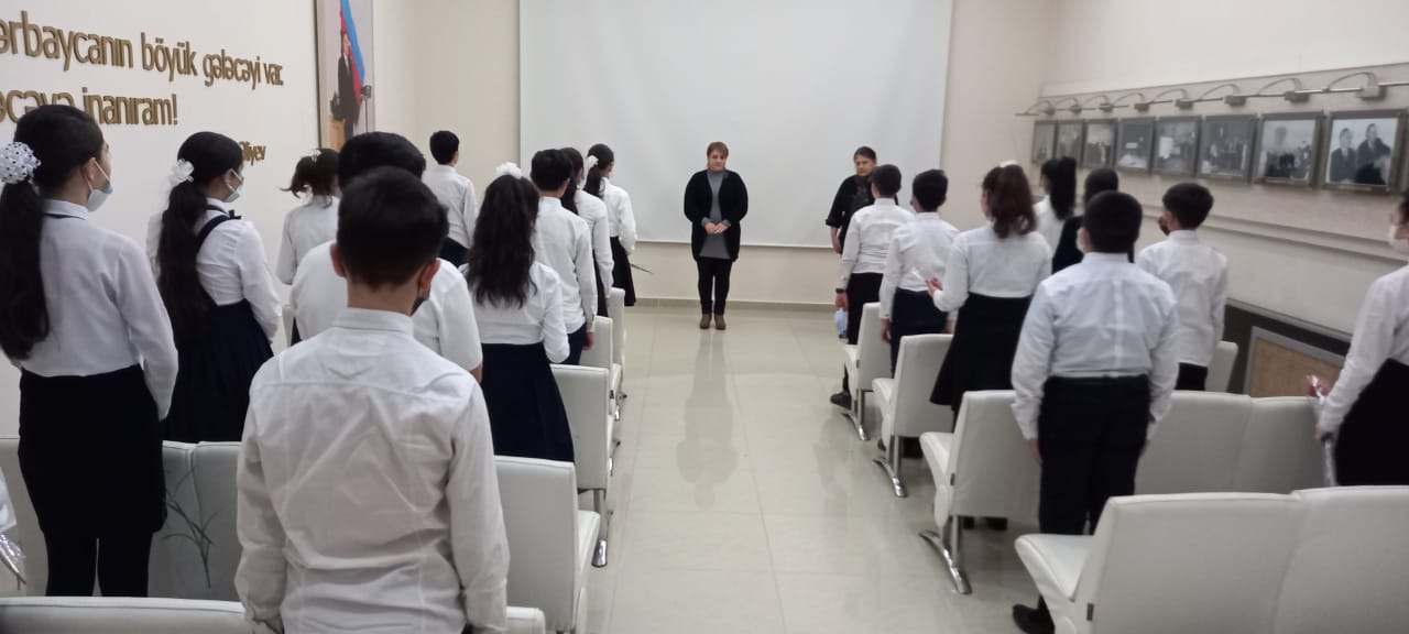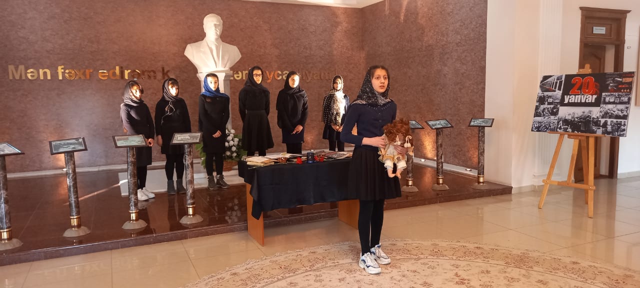 Daha sonra mərkəzin bələdçisi Şəhla İsmayılova çıxış edərək 20 yanvar faciəsinin tariximizdə və qan yaddaşımızdakı əhəmiyyətindən danışdı : “Müstəqil dövlətçilik ənənələrimizi bərpa etmək uğrunda aparılan mübarizənin mühüm mərhələsini təşkil edən 20 Yanvar faciəsi azadlığımızın rəmzi abidəsinə çevrilib. Azərbaycan gənciliyi xoşbəxtdir ki, güclü ordusu və qətiyyətli LİDERi olan ölkədə yaşayır. Bu isə xalqımızın bir daha faciələrlə, soyqrımlarla sınağa çəkilməyəcəyinə tam təminat verir. İllər keçsə də, şəhidlərimizin qanının hədər axmadığını, o qanlar bahasına bugünkü azadlığımızın, müstəqilliyimizin, dövlət quruculuğumuzun, tərəqqimizin bünövrəsinin qoyulduğunu gələcək nəsillər böyük ehtiramla xatırlayacaqdır. Çünki ümummilli liderimiz Heydər Əliyevin də dediyi kimi: “Hər bir şəhid millətin mənəvi ucalığıdır. Şəhidlik milləti yüksəldən, milləti millət edən amillərdən biridir”.![]()