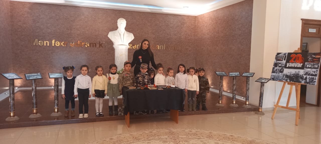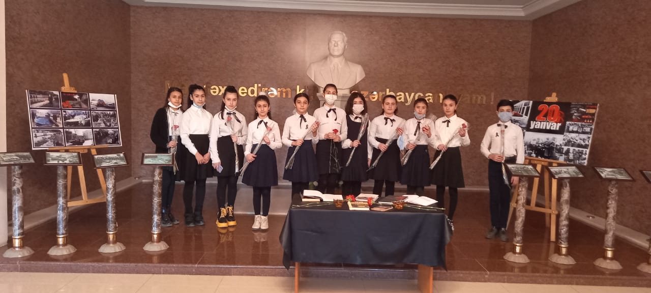 Daha sonra şagirdlər əvvəlcə 20 Yanvar şəhidlərinin xatirisənə həsr olunmuş şəkil-kitab sərgisi ilə tanış oldular. Sərgi ilə tanışlıq zamanı ı mərkəzin əməkdaşı Nuridə Qədirova Ümummili liderin 20 yanvar faciəsinə münasibəti barəsində şagirdlərə ətraflı məlumat verərək bildirdi ki, Heydər Əliyev həmin günlərdə özünün və ailəsinin həyatını təhlükə altına ataraq Azərbaycanın Moskvadakı daimi nümayəndəliyinə gəlmiş, kommunist partiyası rejiminin Azərbaycanda həyata keçirdiyi qanlı aksiyanı qətiyyətlə pisləmiş, xalqımıza qarşı törədilən bu cinayətə, günahsız insanların öldürülməsinə etirazını bildirmiş, təqsirkarların cəzalandırılmasını tələb etmişdir. Ulu öndər Heydər Əliyev həmin günlərdə Azərbaycan xalqının kədərini bölüşməklə yanaşı, qanlı 20 Yanvar hadisəsinə ilk həqiqi siyasi qiymət vermişdir. ![]()