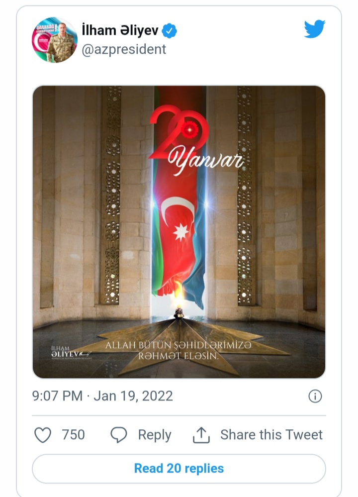 Azərbaycan Prezidenti İlham Əliyev tviterdəki hesabında 20 Yanvar faciəsinin ildönümü ilə bağlı paylaşım edib.