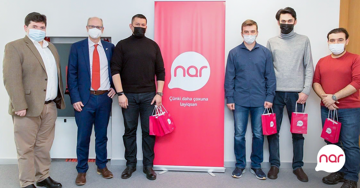 “Azerfon”un Baş icraçı direktoru Qunnar Panke qalib “Nar” komandasının üzvləri ilə görüşub və onları təbrik edib: “Nar” komandasının mütləq çempion olaraq xüsusi seçilməsi sizin əzminiz, savadınız və cəld düşünmə qabiliyyətiniz sayəsində olub. Belə savadlı gənclərin nailiyyətləri bizi sevindirir və uğurlarınızın davamlı olmasını diləyirəm”.![]()