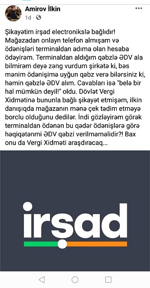 Onun sözlərinə görə, mağazadan onlayn telefon alıb və ödənişləri terminaldan adına olan hesaba ödəyib: ” Terminaldan aldığım qəbzlə ƏDV ala bilmirəm deyə zəng vurdum şirkətə ki, bəs mənim ödənişimə uyğun qəbz verə bilərsiniz ki, həmin qəbzlə ƏDV alım. Cavabları isə “belə bir hal mümkün deyil!” oldu. Dövlət Vergi Xidmətinə bununla bağlı şikayət etmişəm, ilkin danışıqda mağazanın mənə çek tədim etməyə borclu olduğunu dedilər. İndi gözləyirəm görək terminaldan ödənən bu qədər ödənişlərə görə həqiqətənmi ƏDV qəbzi verilməməlidir?! Bax onu da Vergi Xidməti araşdıracaq…”(tia.az)![]()