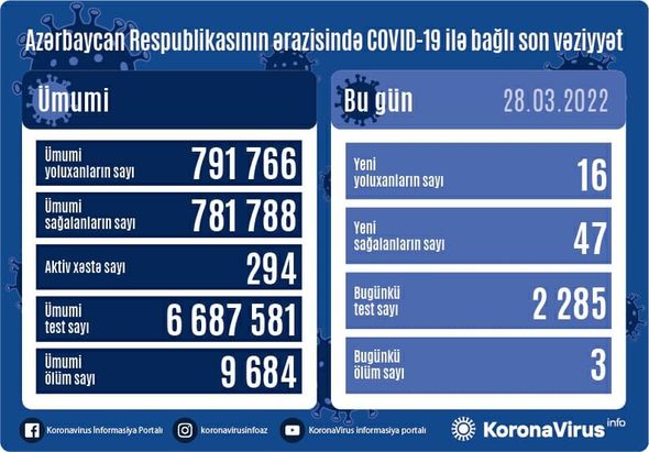 Azərbaycan Respublikasında koronavirus (COVID-19) infeksiyasına 16 yeni yoluxma faktı qeydə alınıb, 47 nəfər müalicə olunaraq sağalıb.