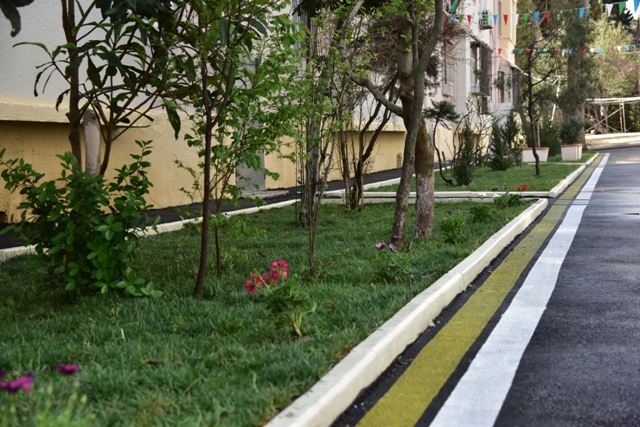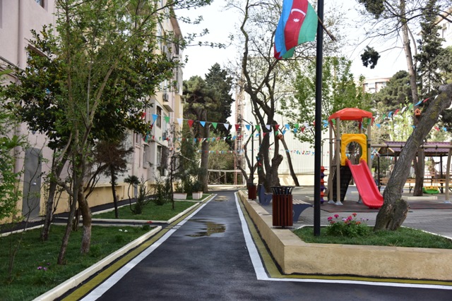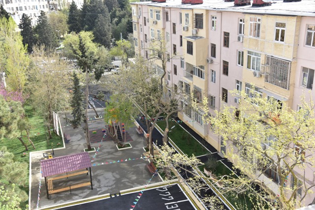 Görülmüş işlər çərçivəsində binaların əhatə etdiyi həyətə 1000 kv.m-ə yaxın asfalt örtüyü, 1500 kv.m-dən artıq qazon, 500 kv.m tamet daşı vurulub, 350 p.m. yeni bardürlər və kiçik tullantıların atılması üçün yeni zibil qutuları qoyulub, 100 p.m. istinad divarı bərpa olunaraq aqlay daşla üzlənib. Əlillərin sərbəst hərəkəti üçün panduslar quraşdırılıb.