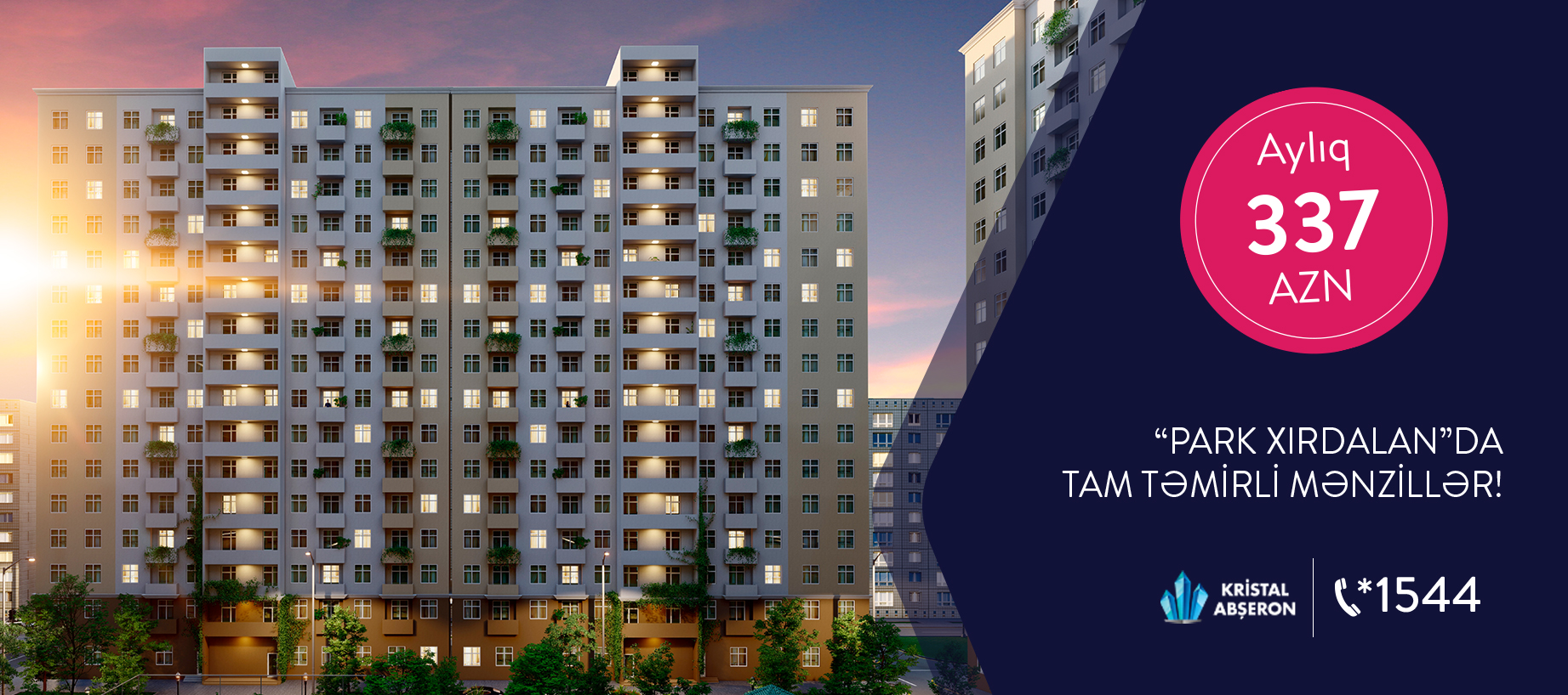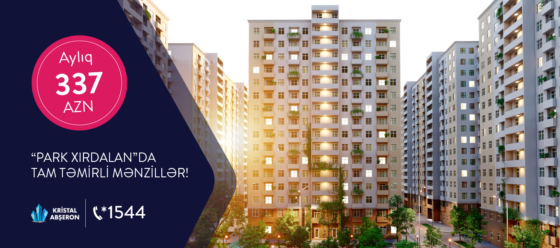 Siz də 20 ilədək kredit imkanları ilə, AYLIQ SADƏCƏ 337 AZN ödəməklə "Park Xırdalan”dan mənzil sahibi ola bilərsiniz!