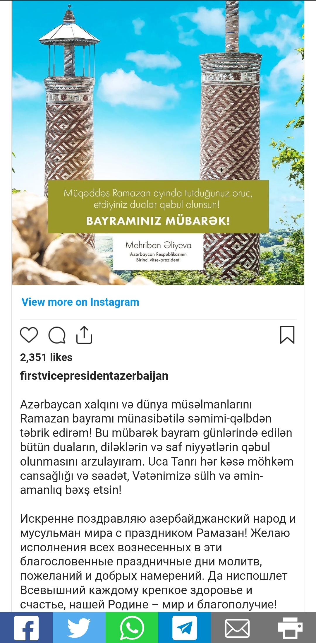 “Azərbaycan xalqını və dünya müsəlmanlarını Ramazan bayramı münasibətilə səmimi-qəlbdən təbrik edirəm! Bu mübarək bayram günlərində edilən bütün duaların, diləklərin və saf niyyətlərin qəbul olunmasını arzulayıram. Uca Tanrı hər kəsə möhkəm cansağlığı və səadət, Vətənimizə sülh və əmin-amanlıq bəxş etsin!”![]()