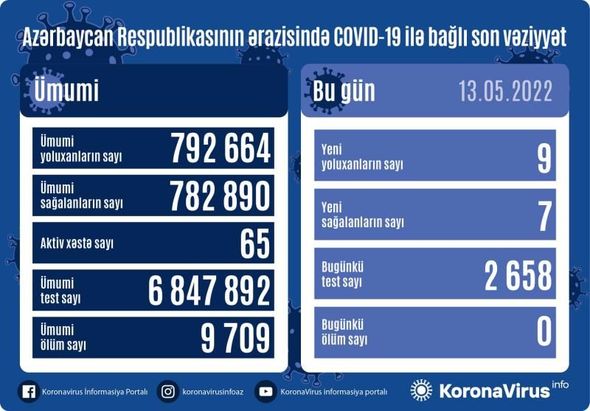 Azərbaycanda indiyədək ümumilikdə 792 664 nəfərin koronavirus infeksiyasına yoluxması faktı müəyyən edilib. Onlardan 782 890 nəfər müalicə olunaraq sağalıb, 9709 nəfər vəfat edib, aktiv xəstə sayı 65 nəfərdir.