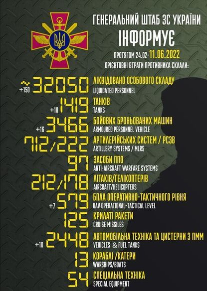 Gedən döyüşlərdə Rusiya ordusunun 1419 tankı, 3466 zirehli döyüş maşını, 712 artilleriya sistemi, 222 reaktiv yaylım atəşi sistemi, 97 HHM sistemi, 212 təyyarəsi, 178 helikopteri, 2448 avtomobil texnikası, 13 gəmisi, 579 kəşfiyyat PUA-sı, 54 xüsusi texnikası, 125 qanadlı raketi məhv edilib. (oxu.az)