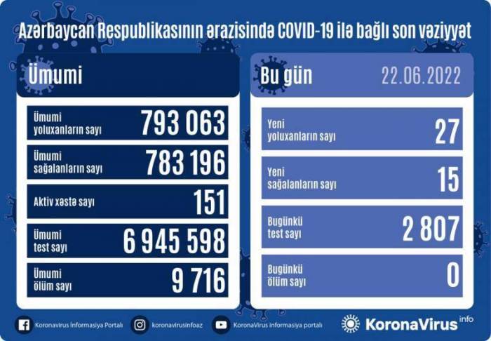 Azərbaycanda koronavirus (COVID-19) infeksiyasına 27 yeni yoluxma faktı qeydə alınıb, 15 nəfər müalicə olunaraq sağalıb.