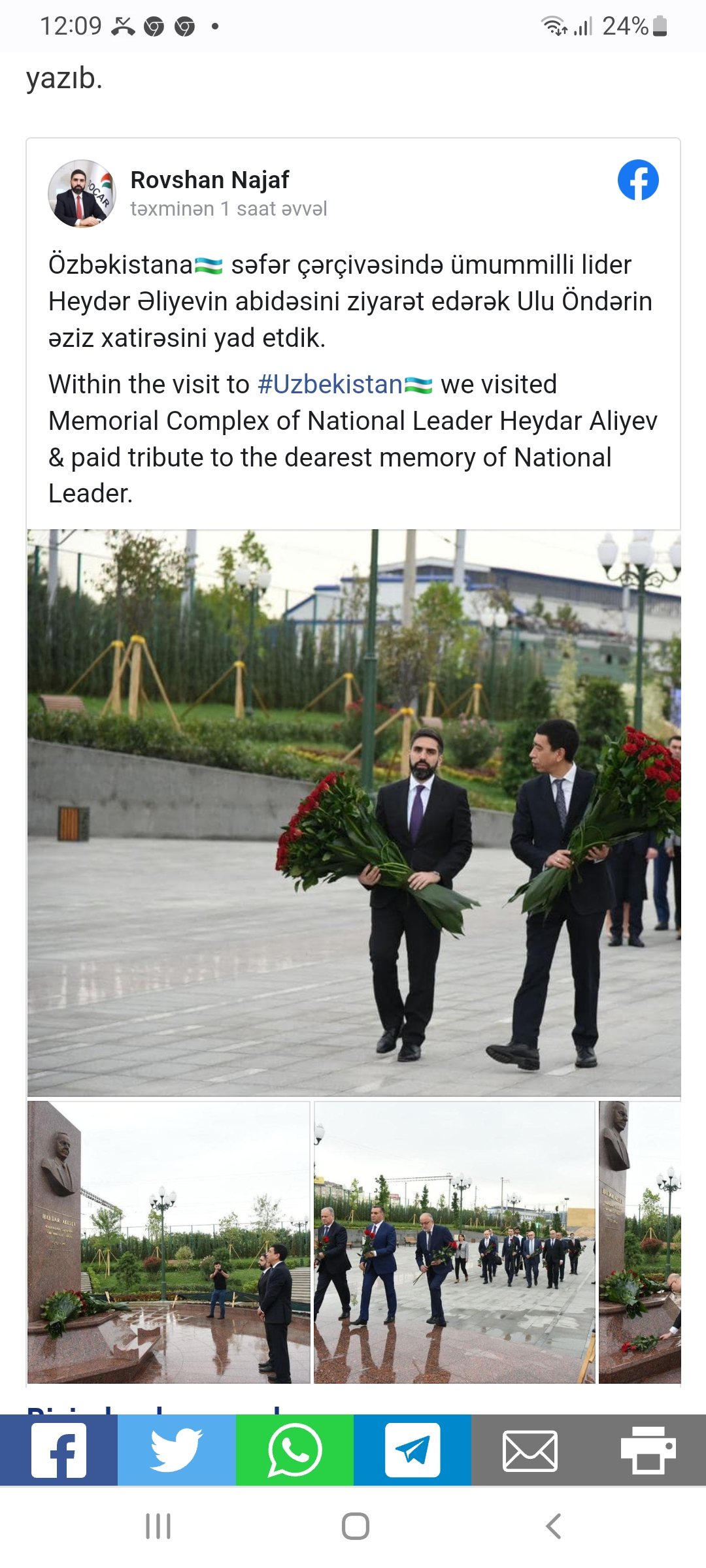 “Özbəkistana səfər çərçivəsində ümummilli lider Heydər Əliyevin abidəsini ziyarət edərək ulu öndərin əziz xatirəsini yad etdik”.