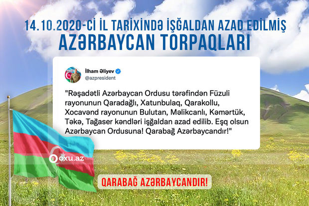 Rubrika.Az xatırladır ki, Azərbaycan Ordusu həmin gün Füzuli rayonunun Qaradağlı, Xatunbulaq, Qarakollu kəndlərini düşmən tapdağından azad edib.
