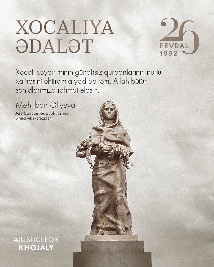 Birinci vitse-prezident Mehriban Əliyeva sosial şəbəkə hesabında Xocalı soyqırımının ildönümü ilə bağlı paylaşım edib.