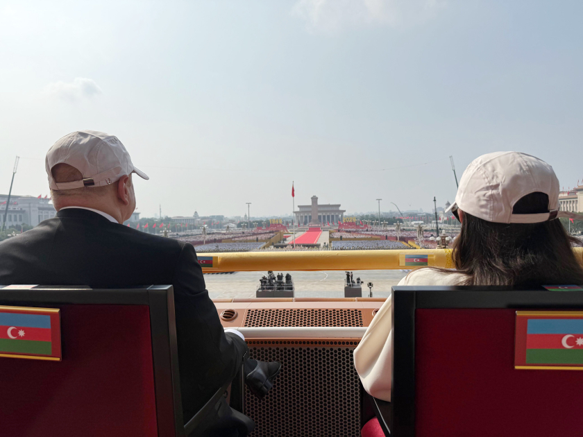 Rubrika.Az xəbər verir ki, Azərbaycan Prezidenti İlham Əliyev və birinci xanım Mehriban Əliyeva paradı izləmək üçün Çinin paytaxtı Pekindəki Tiananmen Meydanına gəliblər.